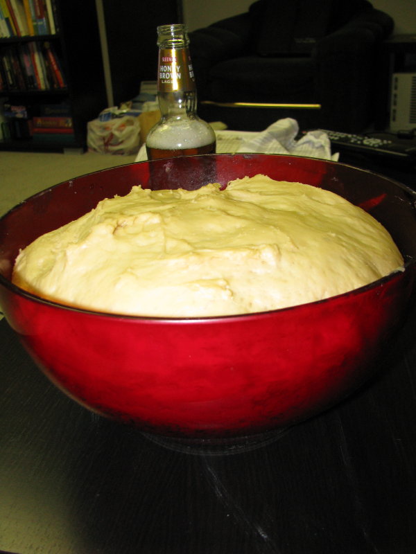 Above is the dough post-rise. It's been a while since I've made a dough recipe that required any kneading, but this dough seemed more awkward to knead than any I'd previously done - perhaps that's because I've flipped to the no-knead approach to bread-making (the healthier sequel to that book also recently arrived in my mailbox). I think that if I do this again I'll have to first look for a no-knead variety - I'd been debating tossing out the dough, but decided post-rise that it seemed reasonable enough.