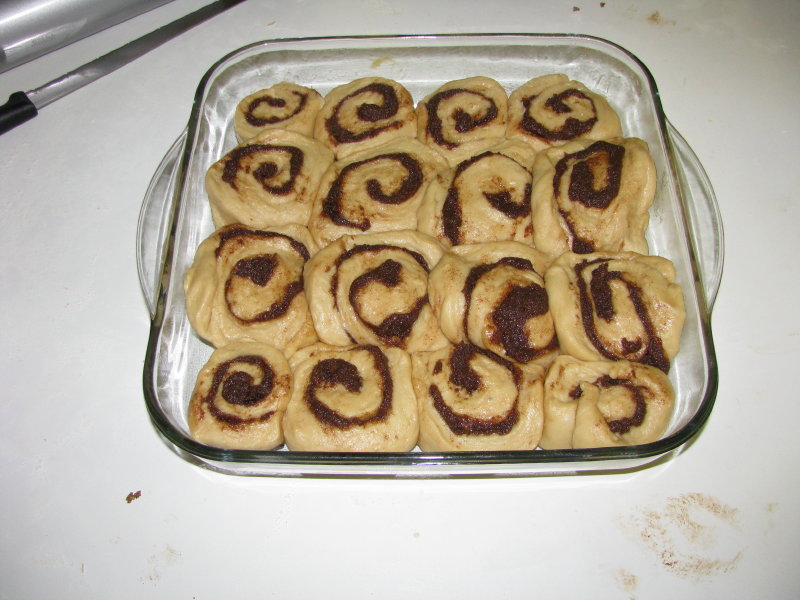 Above are the slightly sketchy looking cinnamon rolls prior to rise #2. I used the largest baking pan that I had 11"x11", but that still seemed a bit tight.